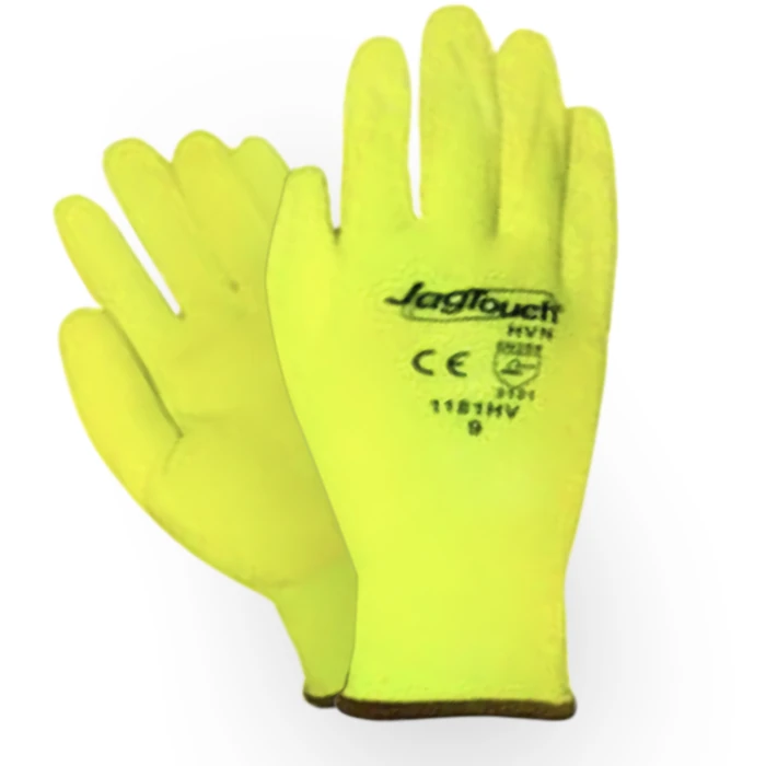 Cut Resistant Gloves Small (S) Coated Fabric 18 Gauge JagTouch 1181 1181 HV JagTouch® HVN 18g Hi-vis yellow nylon/spandex shell w/hi-Vis yellow foam nitrile coated palmQuality StandardGeneral UseItem TypeReusableUseGeneral PurposeTypeGlovesItemCut Resistant GlovesFinishNoneGlove MaterialCoated FabricGlove Thickness18 GaugeCut ResistantLevel 1SizeSmall (S)ManufacturerJagTouch 1181Product SizeSmall (S)Unit of measurePair