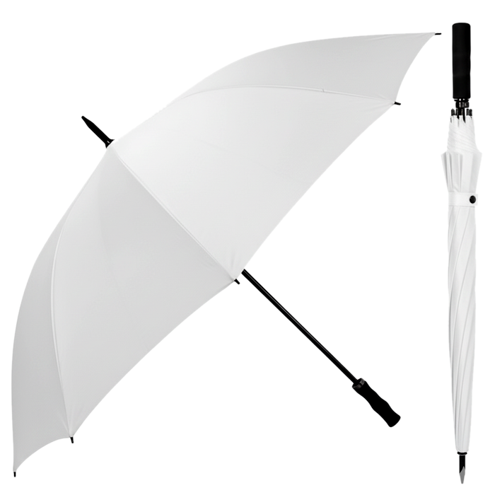Umbrellas Golf Umbrella WhiteMaterialPolyester Canopy with Fiberglass FrameColorWhiteDiameter60"–68"FeaturesExtra Large CoverageHandle TypeEVA foam gripUnit of measureEach