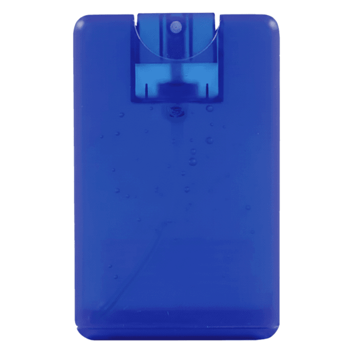 Sanitizers Pocket Spray BlueMaterialPlasticColorBlueSpray TypeSpray PumpFeaturesCompact flat designVolume8 mlUnit of measureEach