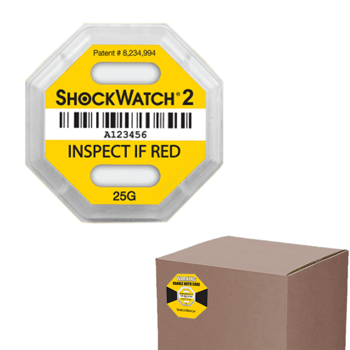 ShockWatch 2 - 25G Indicators are tamper-proof devices that detect moderate impact levels. They alert handlers and receivers when products experience shocks beyond 25G force.